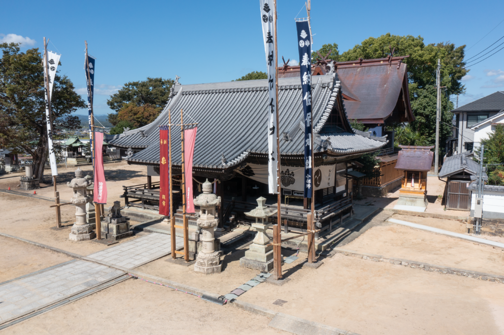垂仁(すいにん)天皇二十三年の創建と伝えられていますがこの当時は加西の鎌倉峰(かまくらのみね)に鎮座されていました。のち奈良時代の初め養老(ようろう)六年(722年)に阿部野三郎太夫(あべのさぶろうだいふ)という翁に神託があり現在の場所にお(うつ)し申し上げたとのことです。 それ以来当社は郡内(旧加東郡内)のみならず播磨でも著名な神社として深い信仰を集めてまいりました。とりわけ鎌倉時代には尼将軍として有名な北条政子が当社を崇敬し、本殿の再建と四方内外に檜造りの鳥居八基を建立(こんりゅう)させていることからもその様子がうかがえます。なお現存する鳥居はありませんが西の内の鳥居は石造りに変わり約 1.2km西の道路脇に残存しており、「鳥居」という地名はこれに由来します。 しかし戦国時代の争乱により社領は荒廃し天文十六年(1547年)には火災 にあい神殿すべてが消失しました。その後永禄七年(1564年)に新殿を再建しましたが昔日の壮観はついに望むことができなくなったといわれています。 また江戸時代には代々将軍家より朱印状(しゅいんじょう)をいただき社領十石を賜り、明治維新を経て明治十四年(1881年)縣社(けんしゃ)に指定されました。なお、戦後この制度 は廃止されました。